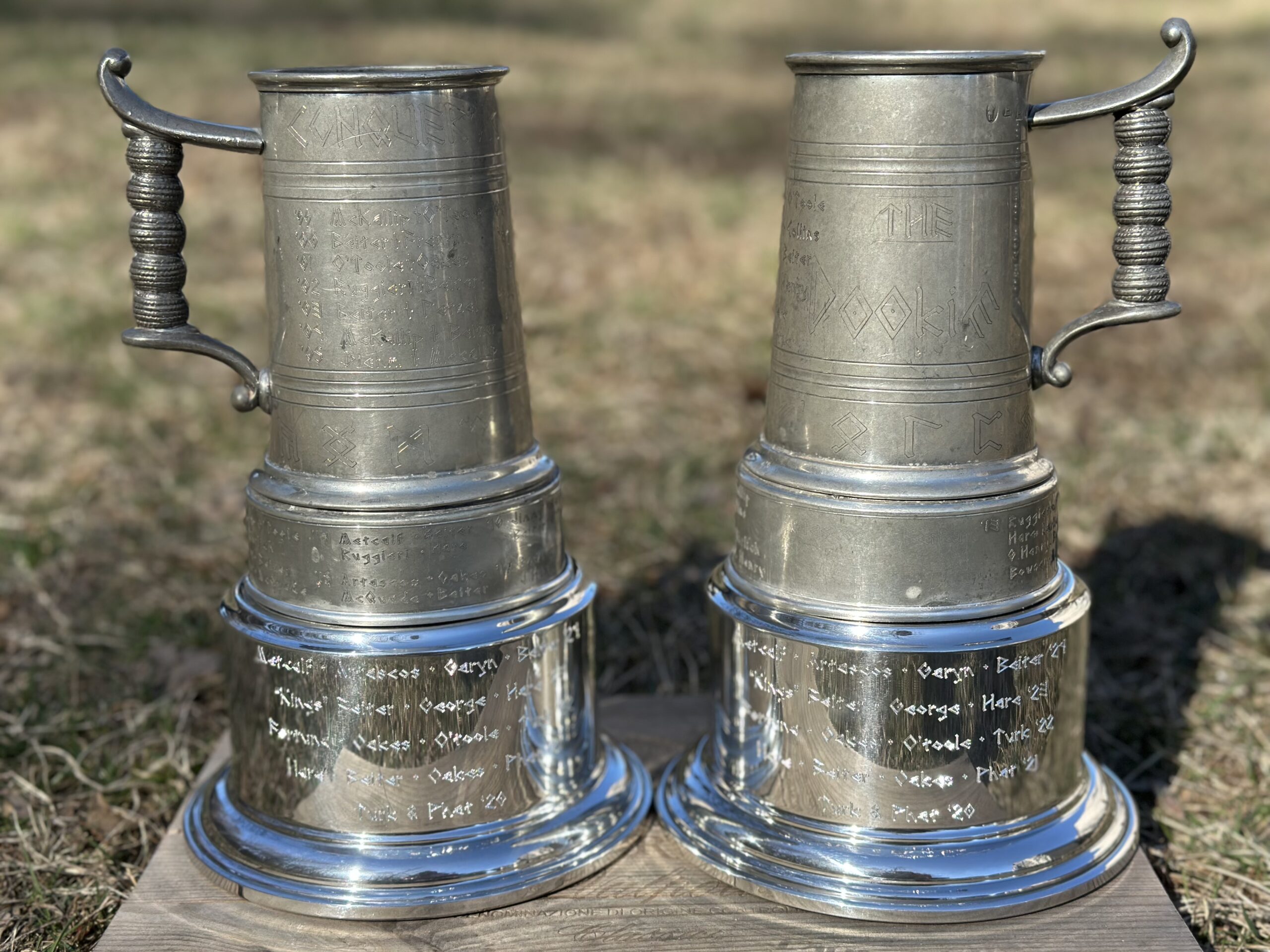 ‘02 - The most competitive tournament ever, with just 16 points separating first and last place. The top-4 spots we’re just 3 points apart! Pewter tankards were ordered from Sheffield England and we got them engraved with the winners name on them: the Mugs were born.